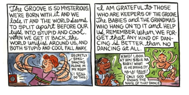AK: I just love this whole book: Lynda Barry’s One! Hundred! Demons! Here are the last two panels of a chapter called “Dancing.” That drawing of a baby dancing just brings me so much joy. And I would like to remind myself, amid all this isolation and sitting still, that I need to get up and move.