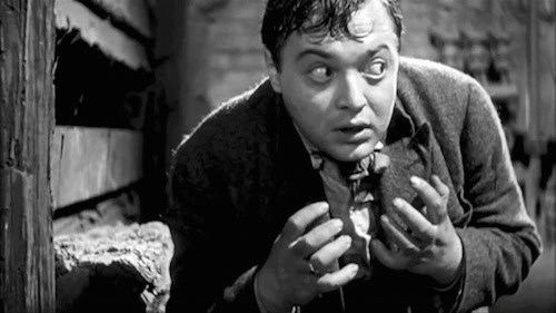The film opens with a washerwoman anxiously waiting for her young daughter to come home. The killer, Hans Beckert (Peter Lorre), has already claimed several victims, and a reward is being offered for his capture. She’s worrying for good reason—her daughter Elsie has already been enticed by Beckert with a colorful balloon he buys from a blind vendor. After Elsie disappears, the police step up their efforts to identify and find Beckert, but they get some help from an unexpected quarter: the heads of organized crime in Berlin, who are so fed up with the frequent raids on their businesses that they decide to find the killer themselves. They enlist the help of the city’s homeless population, who can observe what’s going on without being noticed. Both police and criminals have some success at identifying Beckert—notably, the blind balloon vendor recognizes the tune Beckert was whistling when he kidnapped Elsie, and another homeless man secretly chalks a large white M on Beckert’s back so they can track him easily. Beckert is eventually captured, though not without a fight, and the criminals decide to hold a trial of their own rather than hand him over to the police.